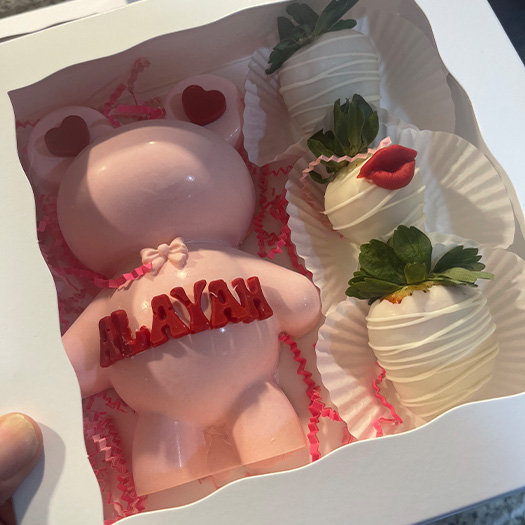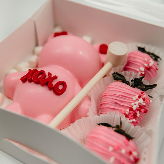 Breakable Bears Come with 3 Covered Strawberries and also has Chocolate Candies Under the Heart. You can customize these by adding your Valentines Name on the Heart – Just give us the name when placing order. This is a perfect way to give a surprise gift. Place the gift under the edible breakable heart and let your Valentine smash the heart to reveal the gift!!